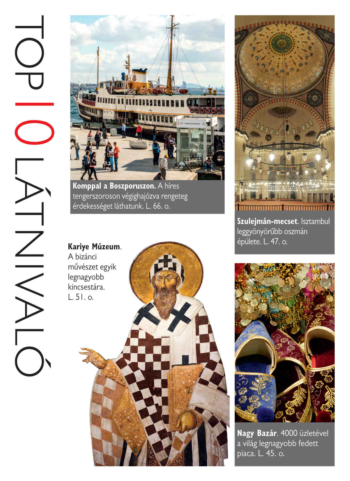 Barangoljon velünk Törökországban! Legújabb útikönyvünk segítségével tervezze meg ideális napjait és fedezze fel a történelmi Törökország építészeti kincseit. Sétáljon fel a lépcsőkön az építészeti csoda képtárába, majd vegye az irányt a Szulejmán-mecset felé. Látogasson el az 500 éves nyüzsgő bazárba, és vásároljon a világ legnagyobb fedett piacán. Legújabb útikönyvünknek köszönhetően ismerkedjen meg Törökország gazdag múltjával, és fedezze fel az ország kultúráját és szokásait. Útikönyvünk mindamellett, hogy hasznos utazási tanácsokkal látja el, nélkülözhetetlen szállás- és étkezési javaslatokkal, valamint hasznos programajánlóval is szolgál mindazok számára, akik szeretnek vásárolni, szórakozni, sportolni.
