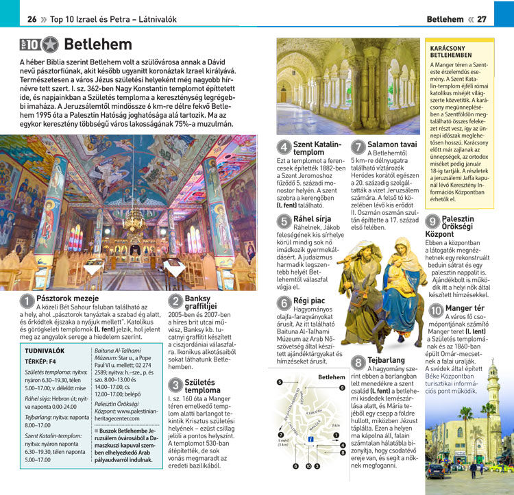 Minden fejezetben TOP 10 műemléket és élményt ajánlunk. Bizonyára értékelik majd az egyes térségek térképeit is. Egy külön fejezetet szenteltünk Petrának. Az útikalauz végén praktikus tanácsokat találnak (érkezés, utazás, szállás), valamint két oldalon áttekinthetik a legfontosabb héber szavakat és kifejezéseket. Ha a nyelvet tekintve felkészültebbek szeretnének lenni, vigyék magukkal a Lingea Héber társalgását.