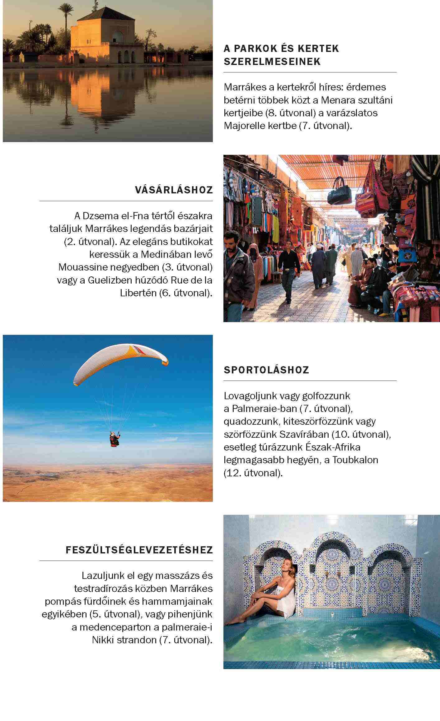 Fedezze fel velünk Marrákest! Útikönyvünk a művészetkedvelőknek, a családoknak és az éjszakai baglyoknak is ajánl útvonalakat a városnéző sétákhoz. Marrákes annyi mindent kínál, hogy nehéz nem beleszeretni. A folyamatos fejlesztések és az egyre növekvő turizmus ellenére továbbra is kivételes és autentikus marokkói élményt nyújt. A város a hegyek és a sivatag között, Afrika és Arábia kulturális találkozásánál épült. Ismerjük meg történelmét a Marrákes Múzeumban, majd vessük bele magunkat Dzsema el-Fna tér melletti legendás piacok és bazárok forgatagába. Tekintsük meg a Koutoubia mecset 12. századi minaretjét, hagyjuk, hogy elkápráztasson a pazar Ben Jusszef Medresze, és vesszünk el a Bahia Palota labirintusában. A parkok és kertek szerelmeseinek érdemes betérni többek közt a Menara szultáni kertjeibe és a varázslatos Majorelle kertbe. Ha elfáradtunk, lazuljunk el egy masszázs és testradírozás közben Marrákes pompás fürdőinek és hammamjainak egyikében, vagy pihenjünk a medenceparton a palmeraie-i Nikki strandon. Hasznos információink segítenek megismerni a helyi konyhát, a vásárlási, szórakozási és pihenési lehetőségeket. Válogassunk az éttermek, bárok és hotelek között. A felfedezőutak során segítségükre lesz a részletes, összehajtható térkép is.